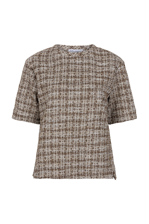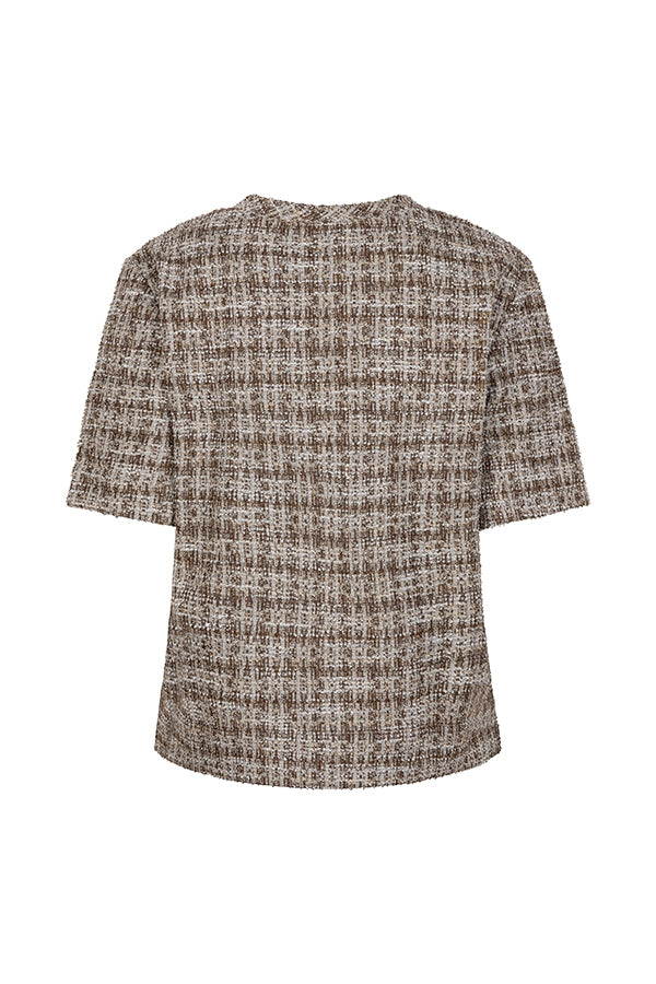 Top Eva is een geruite top met korte mouwen en een boxy fit. De top heeft een hoge ronde hals en is gemaakt van tweed stof met een subtiele glinstering dankzij de lurexdetails. De top is qua pasvorm losvallend.