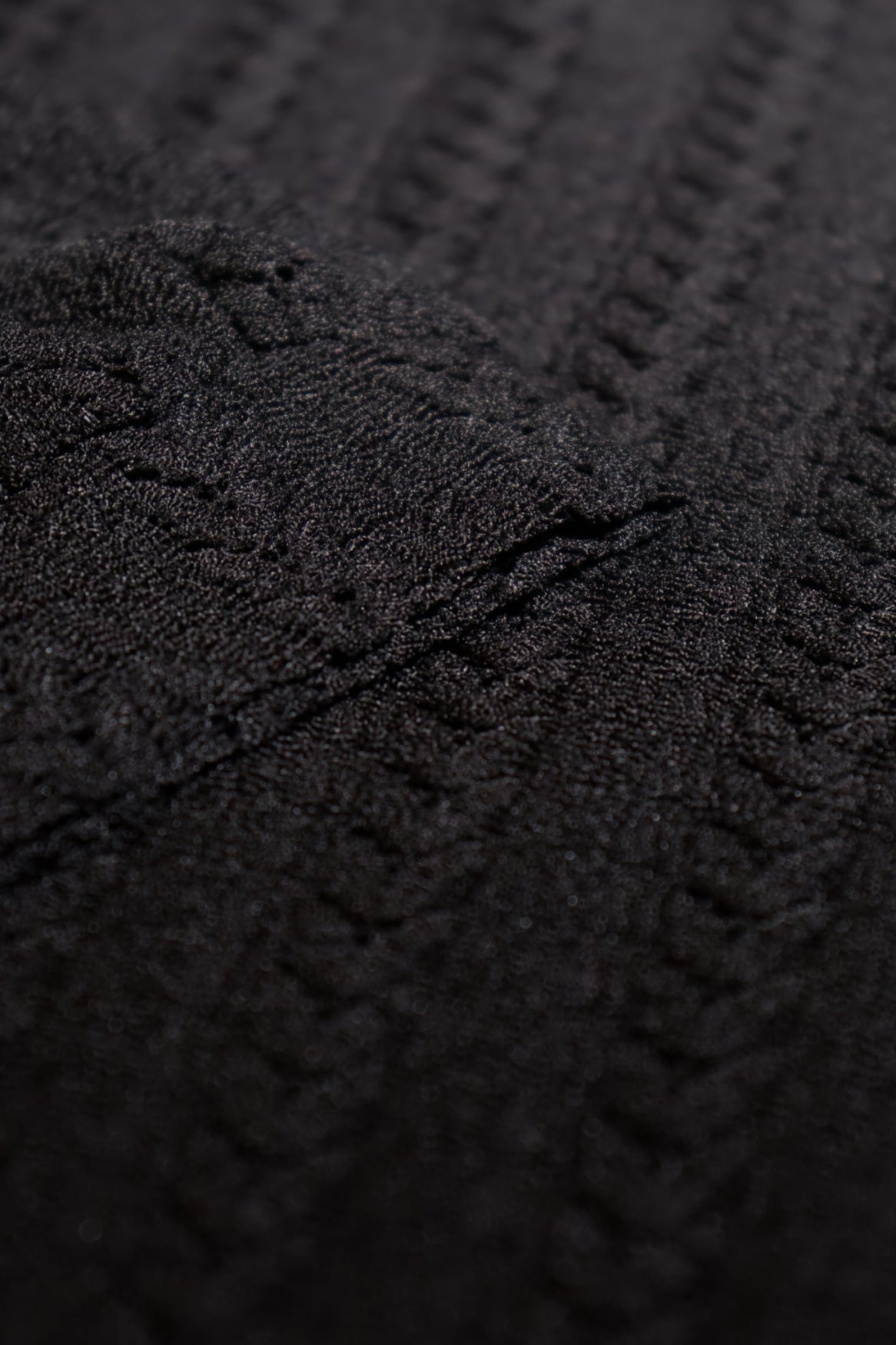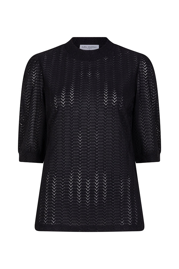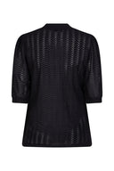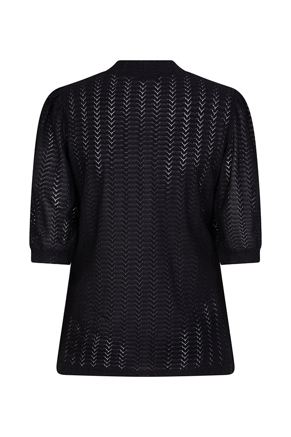 Top Kensi is een aangesloten zwarte top met mouwen tot aan de elleboog. De zwarte top heeft een opstaande kraag, structuur in de stof en een subtiele pofmouw.