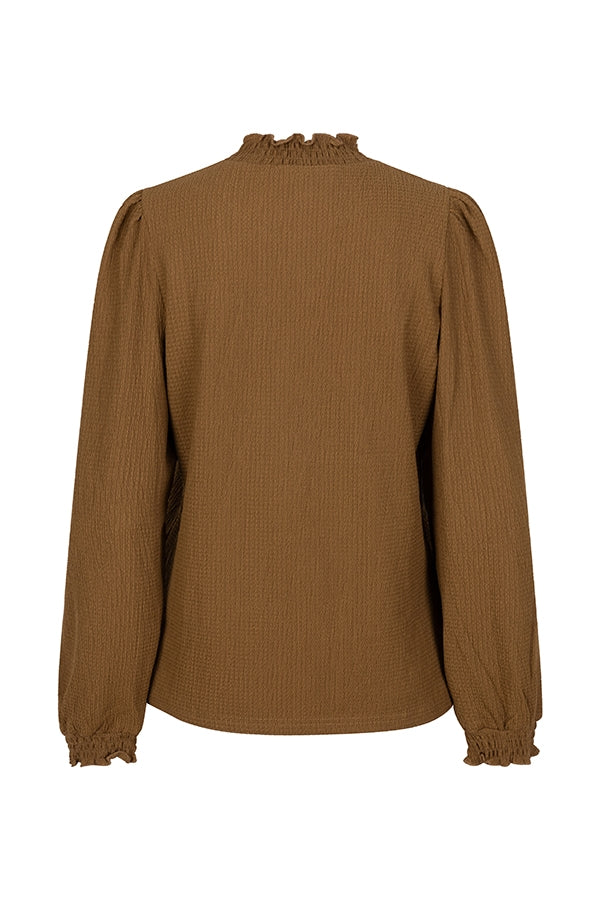 Top Rozalia een groene top met patroon. De groene top heeft zowel smockdetails bij de hoge kraag als mouwuiteinden. De top bevat veel stretch en is qua pasvorm rechtvallend.