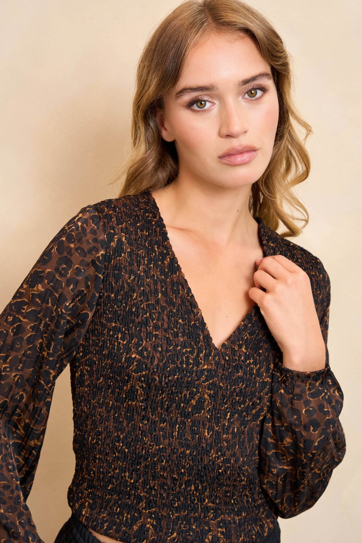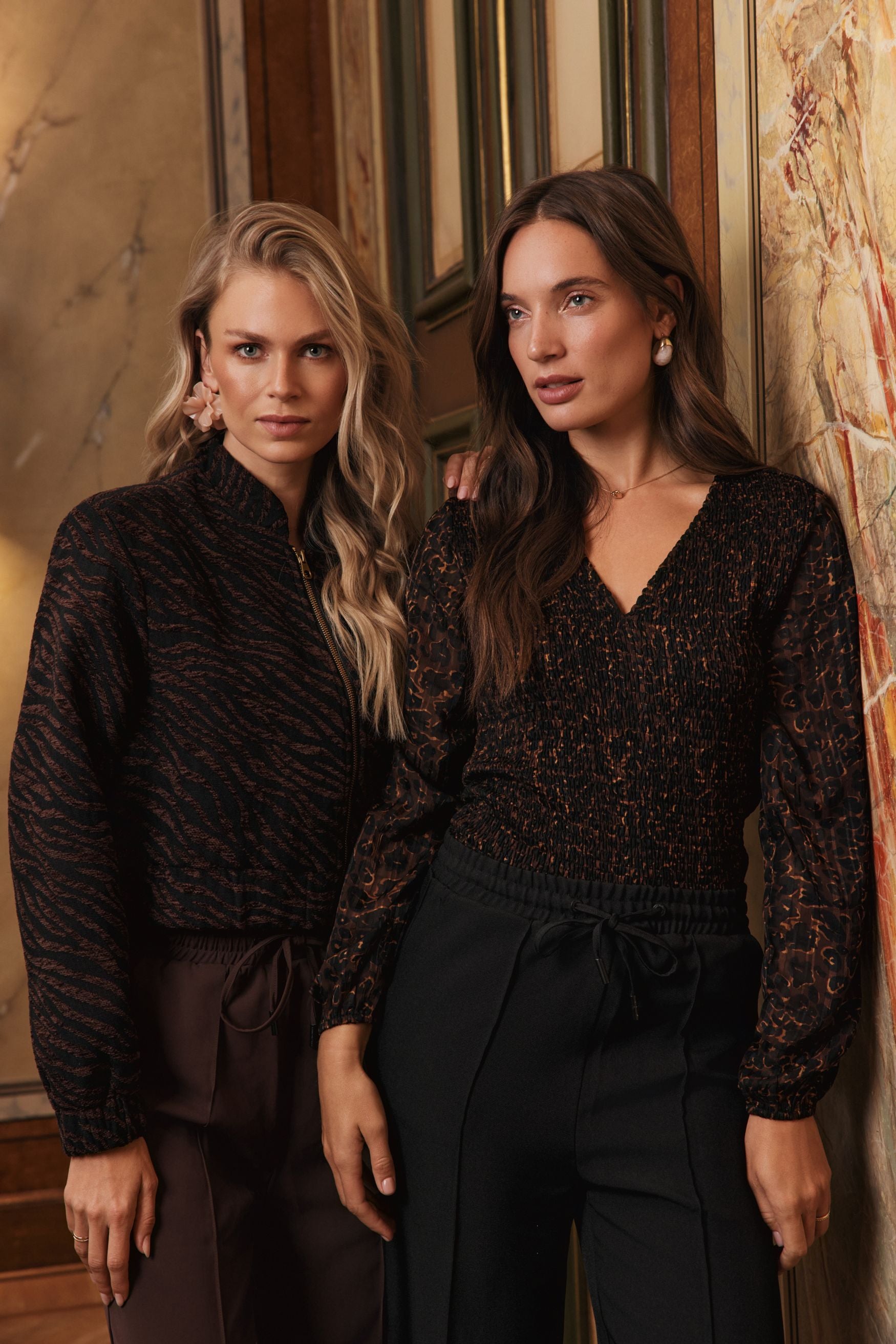 Top Signe is een bruine top met panterprint. Het lijfje van de top heeft een smockdetail en de top heeft subtiele pofmouwen. Verder heeft de bruine top een V-hals en bevat het veel stretch.