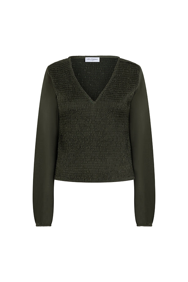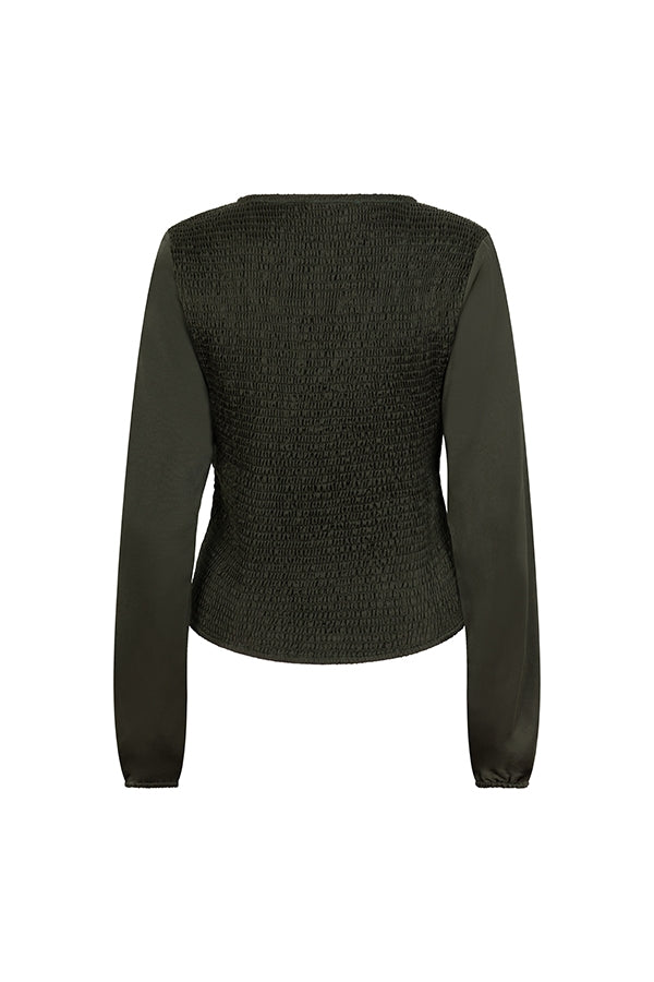 Top Signe is een groene top met panterprint. Het lijfje van de top heeft een smockdetail en de top heeft subtiele pofmouwen. Verder heeft de groene top een V-hals en bevat het veel stretch.