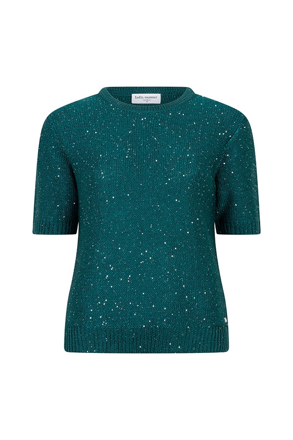 Top Tilia is een teal top met ronde hals en korte mouwen. De stof heeft een subtiele glans door het pailletten detail en voelt zacht aan op de huid. De top valt los om het lichaam en draagt comfortabel. Een fijne keuze voor zowel een casual look als een avondje uit.
