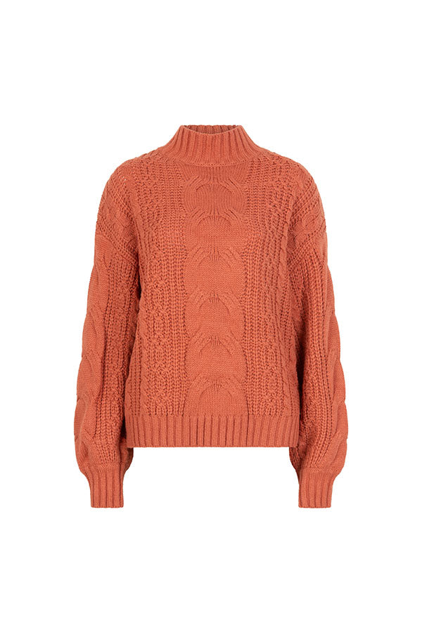 Trui Dagmar is een zalmroze gebreide trui. De trui heeft een opstaande kraag, volumineuze mouwen en kabelstructuur in de stof. De roze kabeltrui is qua pasvorm oversized.