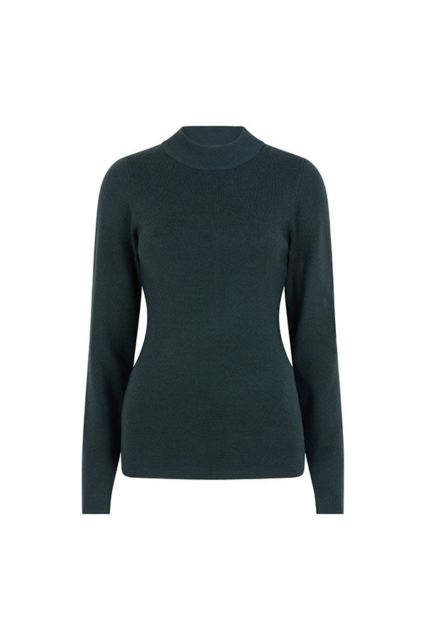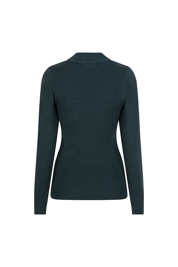 Trui Eloise is een aansluitende groene trui. De groene gebreide trui heeft een opstaande kraag en bevat veel stretch.