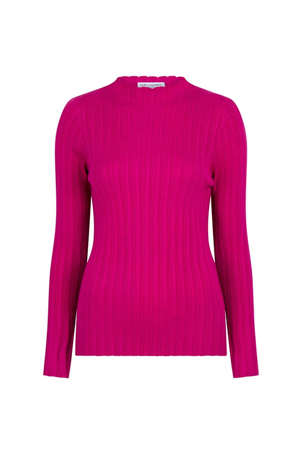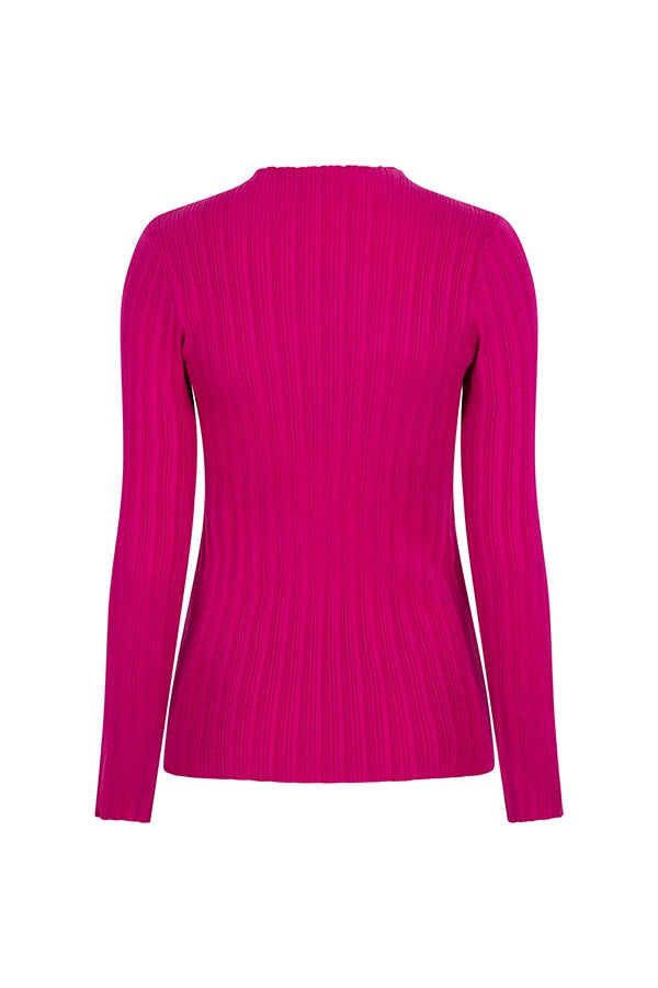 Trui Emily is een roze trui met een aangesloten hals die iets lager is dan een turtleneck. De trui is een top die qua fit aansluitend, maar wel erg stretchy is.