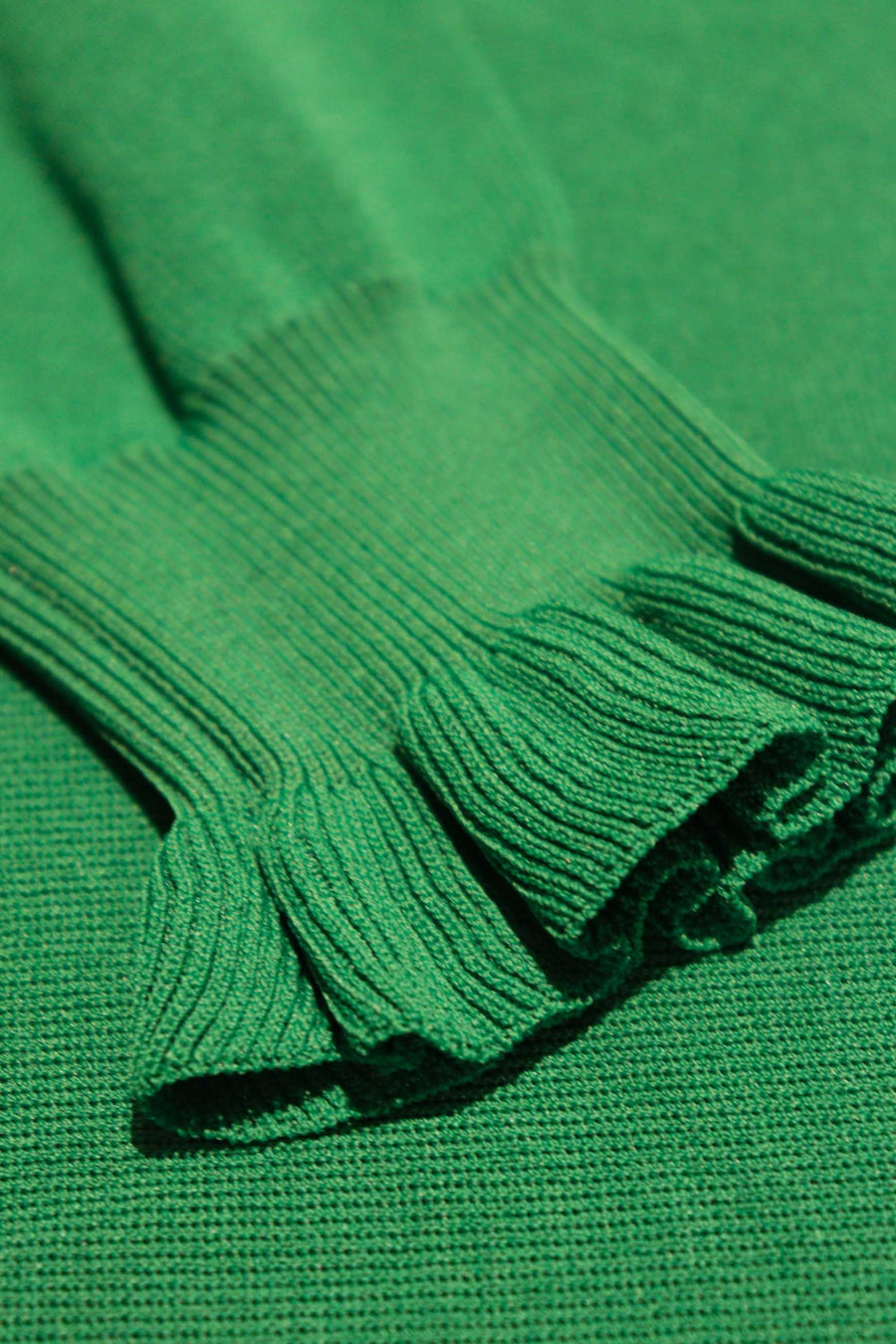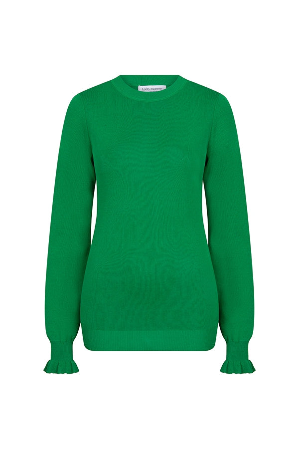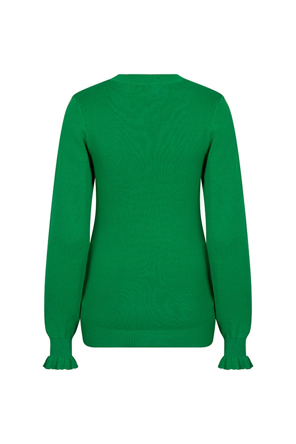 Trui Ilja is een groene trui met een ronde hals en een aangesloten pasvorm. Bij de mouwuiteinden zitten ruffles, wat voor een speelse look zorgt.