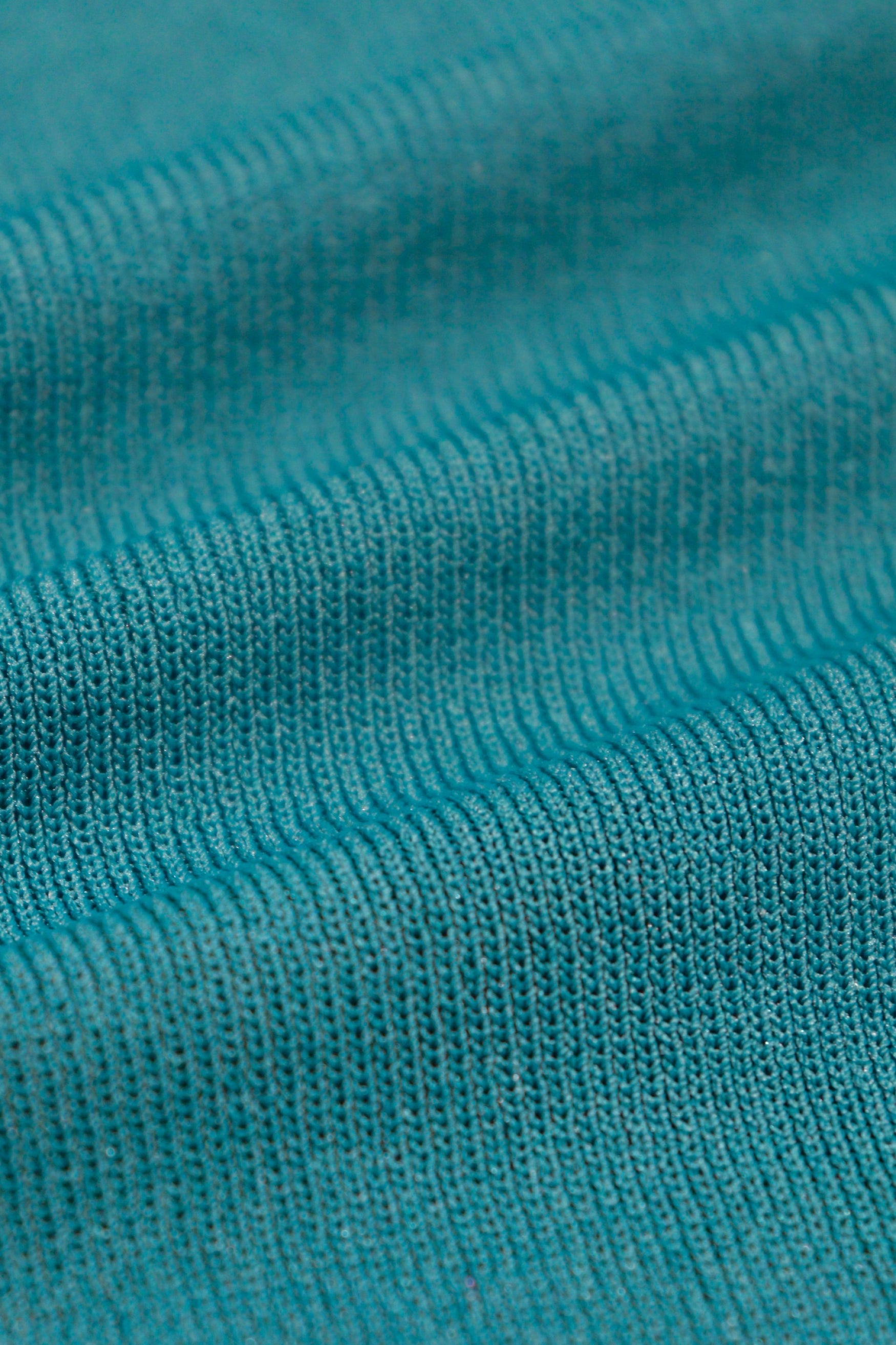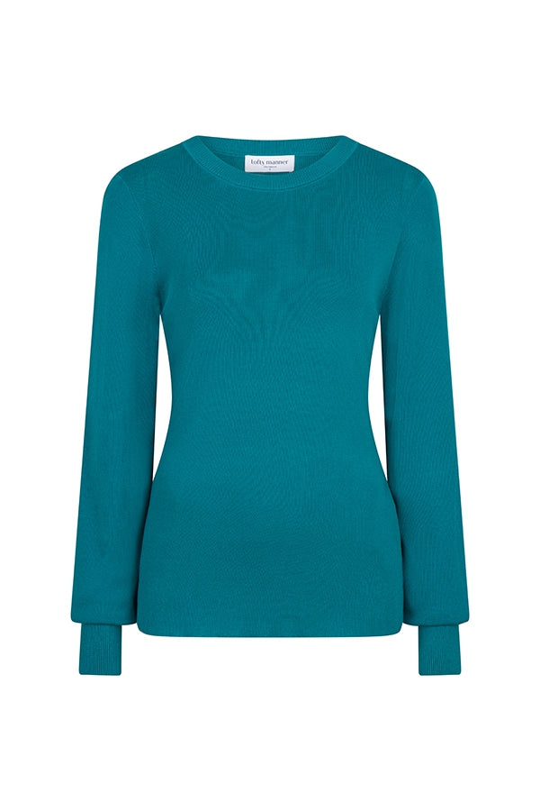 Trui Olivia is een blauwe aansluitende knitwear trui met een hoge ronde hals en losvallende mouwen.