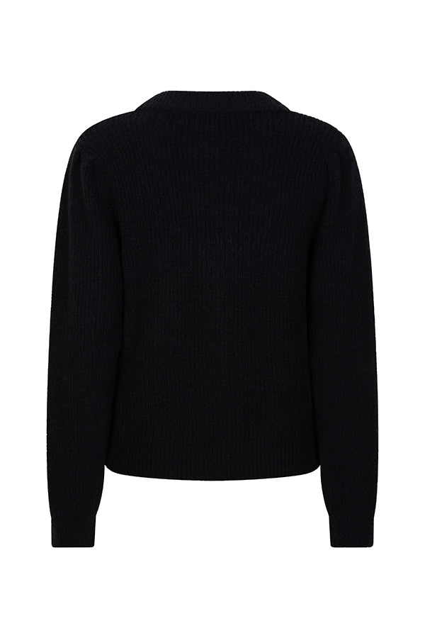Vest Lilly is een zwart gebreid vest met knoopsluiting. Het gebreide vest heeft een V-hals, subtiele pofmouwen en is qua pasvorm aangesloten.